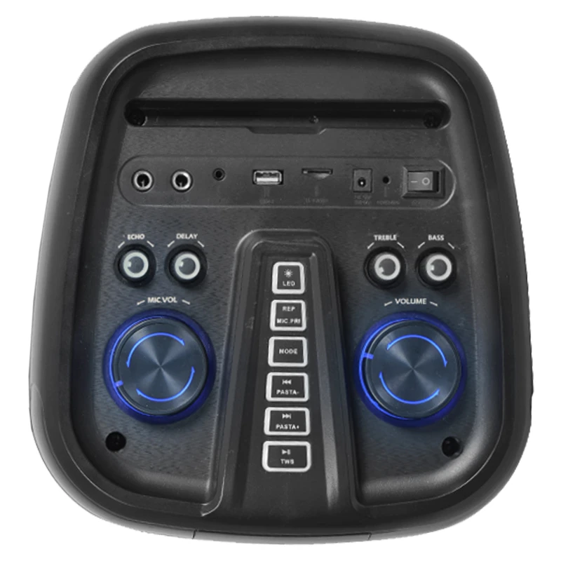در قسمت بالایی این اسپیکر پنل تنظیمات اسپیکر تعبیه شده که شامل دکمههای پاور، تغییر حالت نورپردازی LED ها، تنظیم ولوم، تعویض آهنگ، قابلیت TWS، قابلیت ضبط صدا، ورودی های میکروفن، پورت USB و نمایشگر LED است.