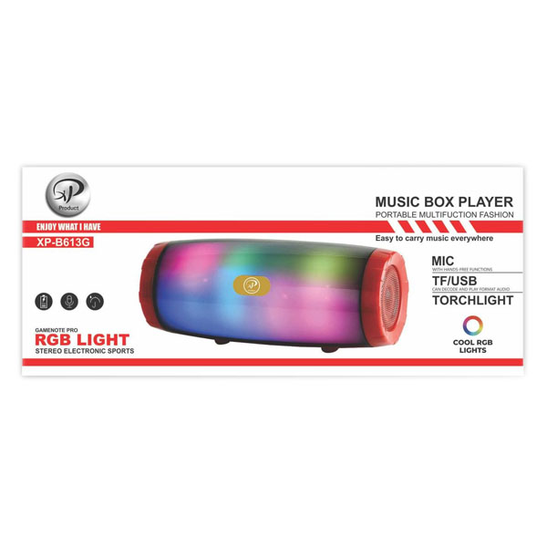اسپیکر بلوتوثی اکس پی مدل B613 باطری 1200 میلی آمپر توان پخش موزیک حدود 3 الی 4 را دارد این اسپیکر از رم میکرو / فلش مموری / aux پشتیبانی می کند نسخه بلوتوث این اسپیکر کوچیک 5.3 وبا RGB بسیار زیبا می باشد