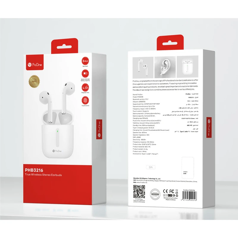 هنگامی که بسته بندی ایرپاد پرووان مدل PHB3216 را باز میکنید، با یک محفظه شارژر، دو عدد گوشی، یک عدد کابل شارژ Type-C و یک دفترچه راهنما مواجه خواهید شد. ایرپاد پرووان مدل PHB3216 از جمله ایرپادهایی است که کیفیت بالایی داشته و عملکرد آن بهگونهای است که تمام نیازهای کاربر از یک هدفون بلوتوثی را برآورده میسازد. محدوده عملکرد 10 متری، یکی از مهمترین خصوصیات این ایرپاد است؛ به این معنا که حتی با وجود فاصله 10 متری ایرپاد از گوشی هوشمند نیز همچنان امکان برقراری تماس تلفنی یا گوش دادن به موسیقی برای کاربر فراهم خواهد بود. ابعاد این مدل ایرپاد برابر با 21.25 ×43.87 ×53.63 بوده و در گروه ایرپادهای سبک و جمع و جور طبقه بندی میشود.