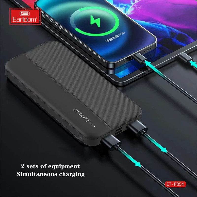پاور بانک Earldom مدل PB54 با ظرفیت 10000 میلی آمپر است که قابلیت شارژ همزمان دو دستگاه را دارد و ضمنا این پاور بانک برای شارژ خود از دو درگاه میکرو و تایپ سی بهره میبرد